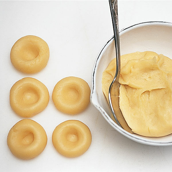 Jeweils 1 knappen EL Teig abnehmen, mit eingeölten Händen Bällchen formen, etwas flach drücken und in die Mitte mit dem Finger den »Nabel« eindrücken.
