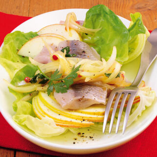 Die klassische Kombination von Matjes und Pellkartoffeln wird aufgefrischt durch Salat und knackige Radieschen.
