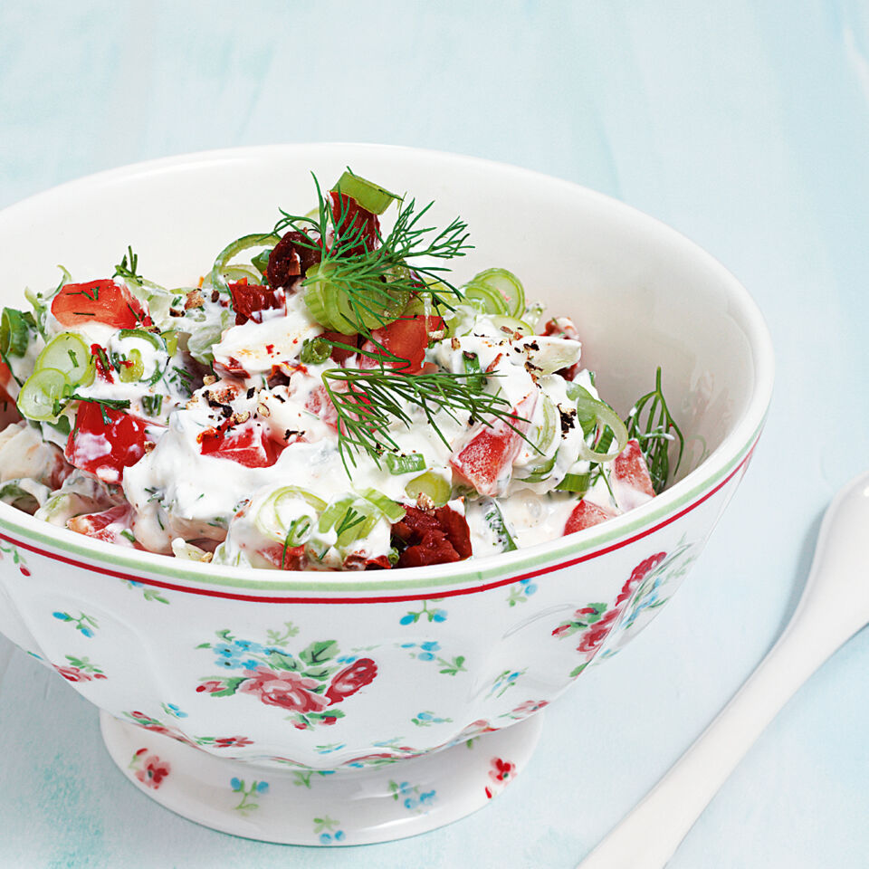 Getrocknete Tomaten fein schneiden. Frische Tomate waschen und klein würfeln, den Stielansatz dabei entfernen. Die Frühlingszwiebeln waschen, putzen und samt knackigem Grün in feine Ringe schneiden. Den Dill abbrausen und trocken schütteln, dicke Stiele abknipsen, Rest fein schneiden.