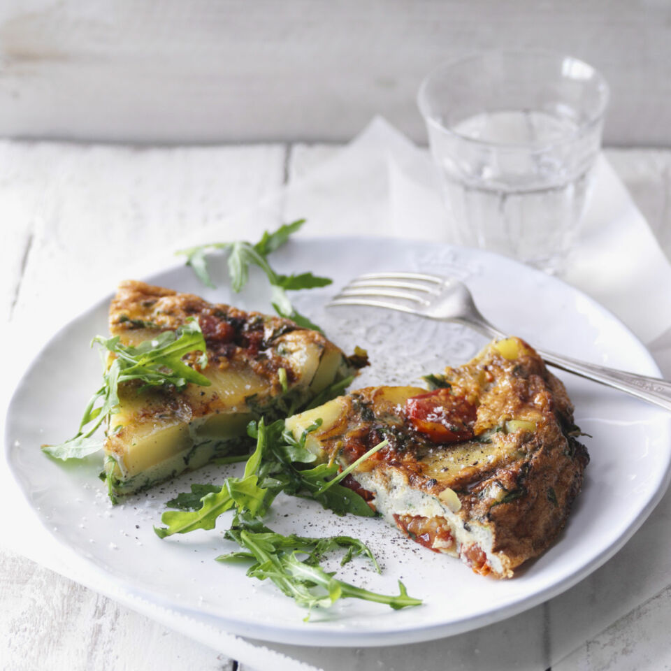 Die verquirlten Eier über die Kartoffel-Gemüse-Mischung geben und alles mit Salz und Pfeffer würzen. Dann zugedeckt bei mittlerer Hitze ca. 5 Min. garen, bis die Eier gestockt sind. Die Frittata vierteln, die Viertel aus der Pfanne nehmen und auf zwei Tellern anrichten. Den übrigen Rucola darüberstreuen.