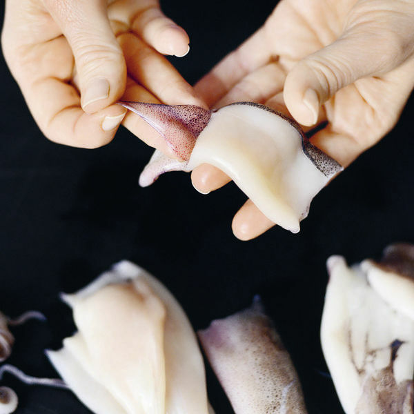 Die Calamari-Tuben gründlich unter fließendem Wasser waschen, abtropfen lassen und trocken tupfen. Tuben von der Haut befreien und in fingerdicke Ringe schneiden, die Tentakeln ganz lassen.