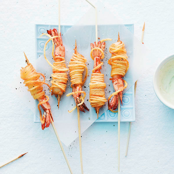 Die Kartoffeln schälen und mit einem Spiralschneider (Haushaltswarenladen) in dünne Streifen schneiden. Die Riesengarnelen mit den Kartoffelspaghetti gleichmäßig umwickeln. Das Öl erhitzen und die Riesengarnelen darin in ca. 1 Min. goldbraun und knusprig frittieren. Herausnehmen, auf Küchenpapier abtropfen lassen und mit Salz und Pfeffer würzen. Mit dem Dip servieren.