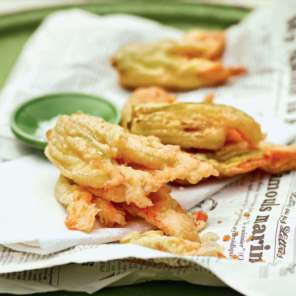 Die Blüten vorsichtig waschen und trocken tupfen, dann Stempel und Staubgefäße innen herausschneiden und die Blüten leicht zusammendrehen. Mehl mit 1 kräftigen Prise Salz, Pfeffer und 1-2 Msp. Chilipulver mischen. Wein und 100 ml Wasser mit dem Schneebesen kräftig unterrühren. Das Ei trennen, Eigelb unter den Teig rühren, zuletzt Öl und Parmesan einrühren und den Teig 30 Min. quellen lassen.