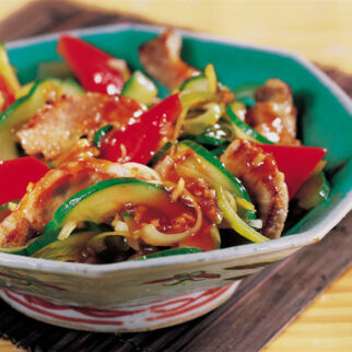 Paprika waschen, putzen und in Rauten schneiden. Den Lauch waschen, putzen und in dünne Streifen schneiden. Ingwer und Knoblauch schälen und in Stifte schneiden.