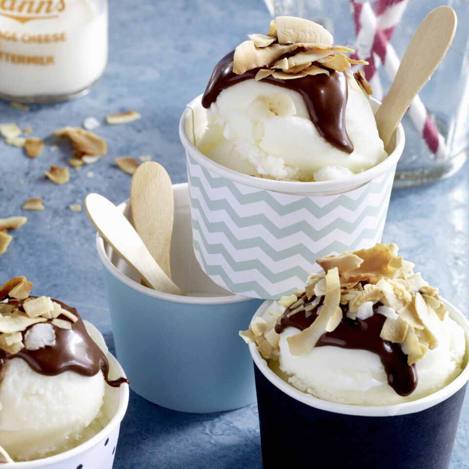 Für die Schokoladensauce 100 g Zartbitterkuvertüre hacken und mit 2 EL Wasser und 50 g Sahne in einem Topf bei schwacher Hitze langsam schmelzen. Nach Belieben mit 1 EL Rum aromatisieren und abkühlen lassen. Den Frozen Yoghurt mit der Schokoladensauce begießen und mit gehackten, karamellisierten Mandeln, zerkleinerten Karamellbonbons oder gerösteten Kokosflocken bestreuen. Die Schokosauce zu einer Portion Frozen Yoghurt servieren.
