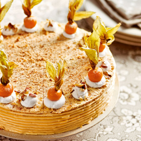 Biskuitboden einmal quer durchschneiden. Den unteren Boden auf eine Tortenplatte legen. Die Zitruscreme auf den unteren Boden streichen, 3 EL für den Rand übrig lassen. Den zweiten Boden auflegen, den Rand der Torte mit der restlichen Creme bestreichen und mit einem Tortenkamm verzieren. Für die Garnitur die Sahne steif schlagen und in einen Spritzbeutel mit Lochtülle füllen. 16 Sahnetupfen auf die Torte setzen und diese abwechselnd mit Physalis und Haselnüssen garnieren. Torte mindestens 2 Std. kalt stellen.