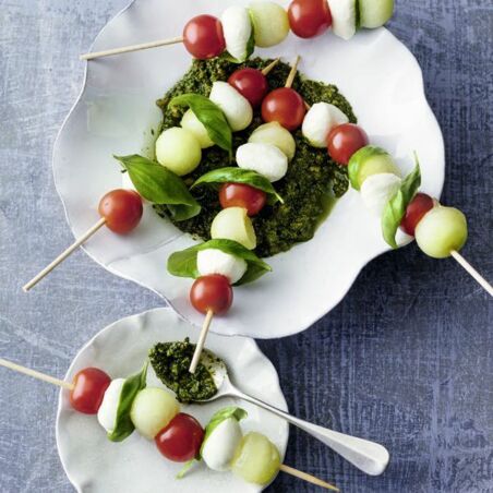Jetzt wird′s spießig: Das nussige Pesto ist eine besonders raffinierte Beigabe. Aber ohne Pesto sind die Spießchen auch für Kinder ein Hit.