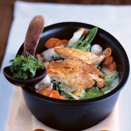 Backofen auf 200° vorheizen. Das Gemüse abgießen – dabei die Brühe auffangen – und in eine Auflaufform geben. Kerbel waschen, trockenschütteln, hacken und darüber streuen. Das Fleisch darauf verteilen.