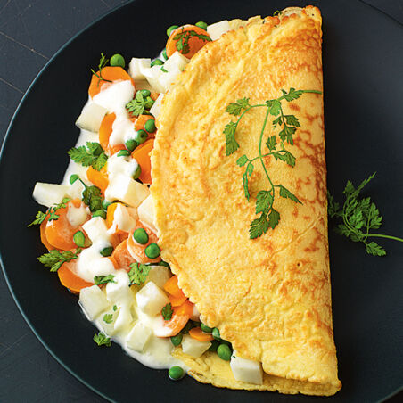 Passen Sie die Füllung für Eierpfannkuchen den Jahreszeiten an: Hier ist die Variante für den Frühling mit Kohlrabi, Möhren und frischen Kräutern!