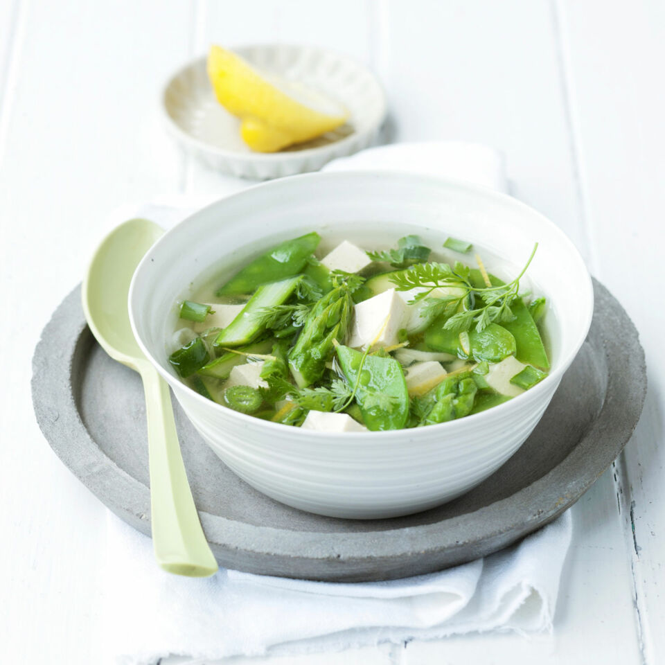 Eine frühlingsfrische Gemüsesuppe in zartem Grün. Der Tofu wird 2 Stunden in einer Zitronenmarinade eingelegt.