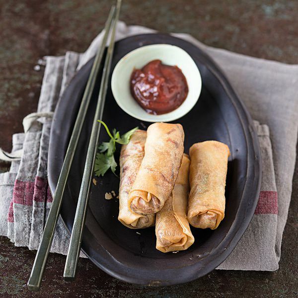 Das Öl im Wok stark erhitzen. Die Hälfte der Frühlingsrollen darin in ca. 3 Min. knusprig braun frittieren. Mit dem Schaumlöffel herausheben und auf Küchenpapier abtropfen lassen. Den Rest ebenso frittieren und abtropfen lassen. Die Frühlingsrollen mit Dip servieren (etwa mit der Pflaumensauce siehe Klappe hinten).