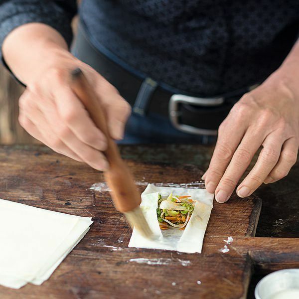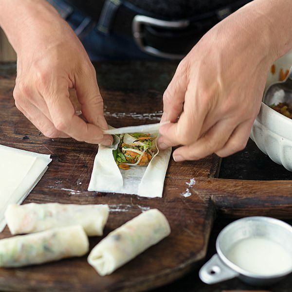 Die Stärke mit 1 EL kaltem Wasser verrühren. Die Füllung in der Mitte der Teigblätter verteilen und die Teigränder mit der Stärke bepinseln. Die Ränder nach innen klappen und die Teigblätter aufrollen, die Ränder dabei fest andrücken. Auf diese Weise alle Frühlingsrollen füllen und aufrollen.