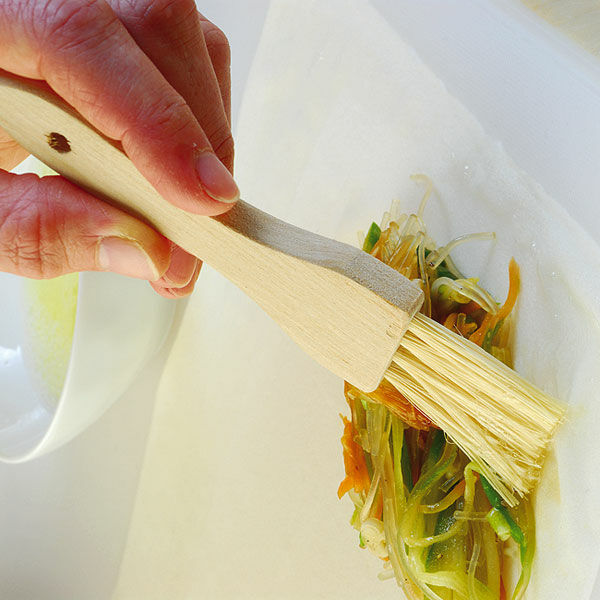 Jeweils 2 Teigblätter auf die Arbeitsfläche legen. Je 2 EL Glasnudelmischung in einer Ecke verteilen. Die Ränder rundum mit Eiweiß bestreichen. Jeweils die gegenüberliegende Ecke der Teigquadrate über die Füllung klappen. Die Seiten darüber falten und die Teigblätter zu kleinen Päckchen aufrollen.