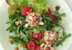 Den Salat mit dem Dressing mischen und auf Teller verteilen. Sprossen und Himbeeren darüberstreuen und die Frischkäsebällchen daraufsetzen. Mit den übrigen Haselnussblättchen bestreuen.