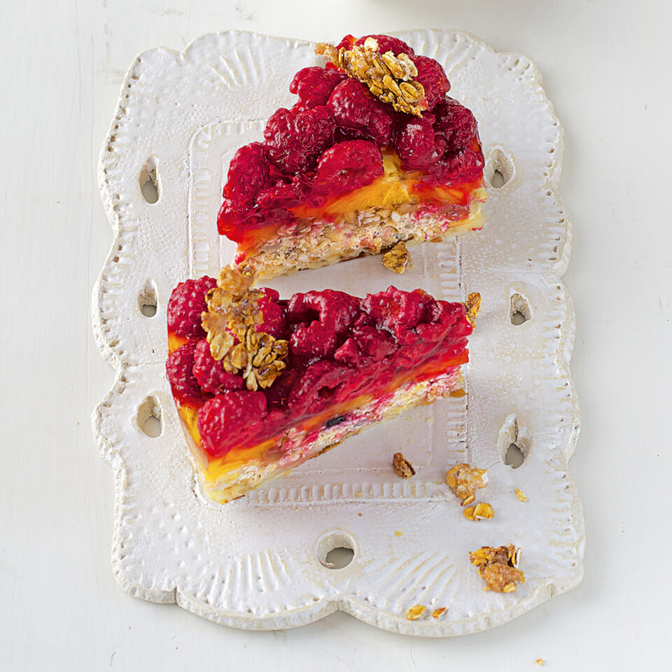 Die Torte ca. 3 Std. in den Kühlschrank stellen und fest werden lassen. Danach aus der Form lösen und nach Belieben mit Haferflockenkrokant bestreuen.