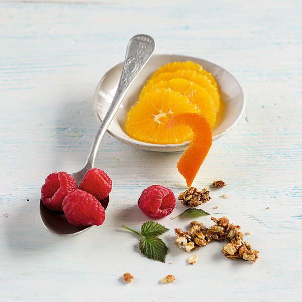 Die restlichen Orangen schälen, in dünne Scheiben schneiden und auf den Müsliboden legen. Die tiefgekühlten Himbeeren da rauf verteilen. Den Apfelsaft löffelweise über die Himbeeren träufeln, damit er schneller geliert.