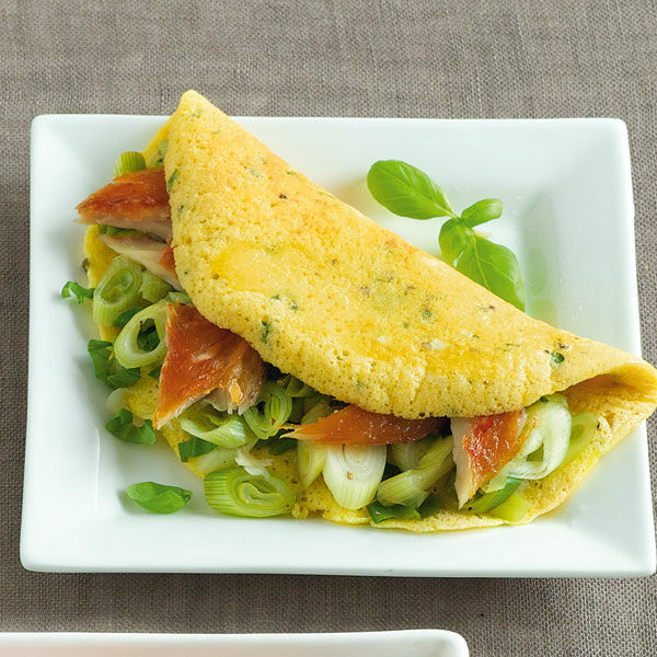 Die klassischen Eierpfannkuchen werden deftig gefüllt: mit Kräutern, Frühlingszwiebeln und Räucherfisch.