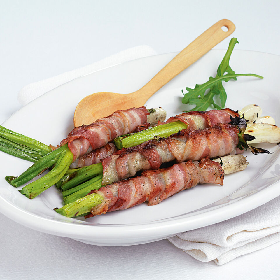Frühlingszwiebeln in Speck