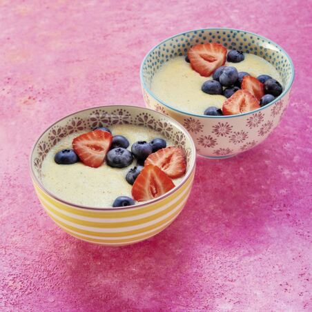 Zum Servieren den Grießbrei auf Schalen verteilen und mit den Beeren oder dem Obst anrichten.