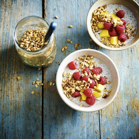 Die Chia-Samen unterrühren. Dann den Chia-Pudding in zwei Schüsseln füllen und über Nacht abgedeckt in den Kühlschrank stellen. Den Chia-Pudding morgens nach Belieben mit frischen Früchten und Granola toppen - er schmeckt aber auch pur.