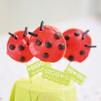 Die Blümchen mit weißem Zuckerguss bestreichen und trocknen lassen. In die Mitte einen Klecks gelben Zuckerguss geben. Die Blümchenkekse auf künstlichem Gras anrichten oder auf dem Esstisch verteilen.
