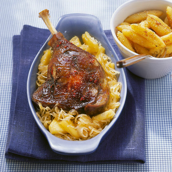 Witwe Bolte hätte diese edle Geflügel-Kraut-Kombination geliebt. Gänsekeulen und Sauerkraut werden im Backofen gegart.