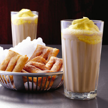 Milchkaffee "portugues" de luxe: Eine safrangelbe Sahnehaube krönt diesen Milchkaffee, der verführerisch nach Vanille und Zitrone duftet.