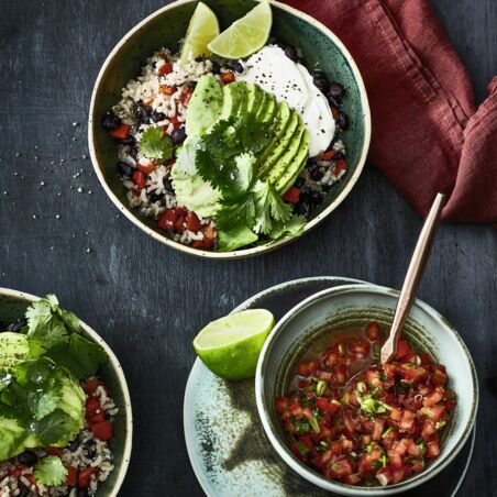 1 große Tomate würfeln und mit 2 EL Frühlingszwiebelringen, 2 gewürfelten grünen Chilis, 3 EL gehacktem Koriandergrün, 1 TL abgeriebener Bio-Limettenschale, 1 EL Limettensaft und 1 EL Olivenöl mischen. Salsa salzen, pfeffern und zum Reis reichen.