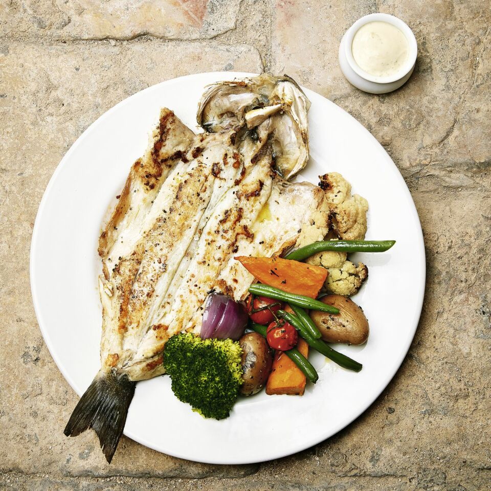 Die Wolfsbarsche auf Tellern anrichten. Die Koriandermayonnaise (oder nach Wunsch auch andere Saucen) separat dazu reichen.