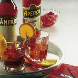 Die Bio-Orange heiß waschen und in den Kühlschrank legen. Reichlich Eiswürfel in ein Rührglas füllen und den Campari dazugeben. Mit dem Barlöffel ca. 20 Sekunden kaltrühren. Anschließend durch das Julep-Sieb in das andere Rührglas abseihen.