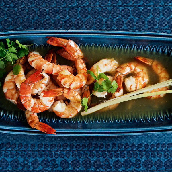 Garnelen sind immer ein Festessen. Diese hier köcheln ganz langsam in einem würzigen Sud aus Reiswein, Ingwer, Koriander und Zitronengras.