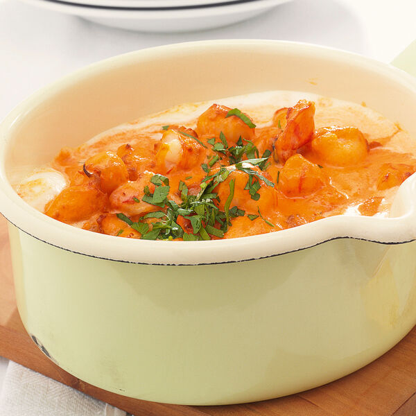 Vitamine – in Sahne verpackt: Wer keine rohen Garnelen bekommt, kann auch vorgegarte verwenden. Diese werden dann nicht gebraten, sondern nur in der Paprikasahne erhitzt.