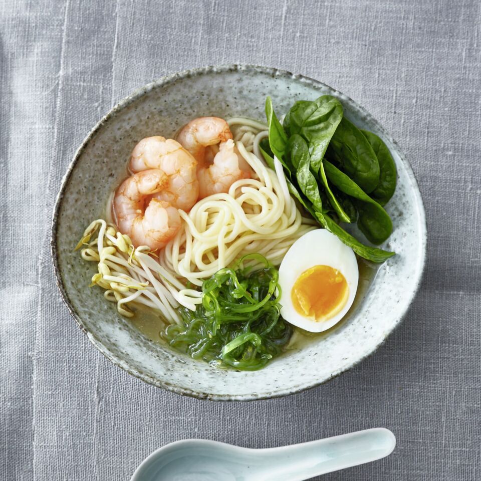 Schmeckt nicht nur euren Gästen: Japanische Nudelsuppe mit Wakame, Kombu-Algen und Garnelen.
