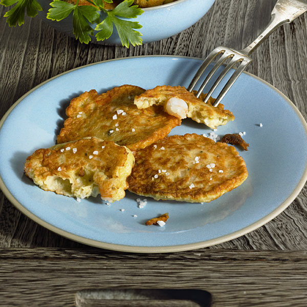 Mehl, Grieß und Mineralwasser verrühren. Thymian, Zitronenschale und Eier unterrühren. Kräftig mit Salz und Cayennepfeffer abschmecken. Die Garnelen hacken. Die Kartoffel schälen, fein reiben, mit den Garnelen unter den Teig ziehen. Zwiebel und Knoblauch schälen, sehr fein hacken und ebenfalls unterziehen.