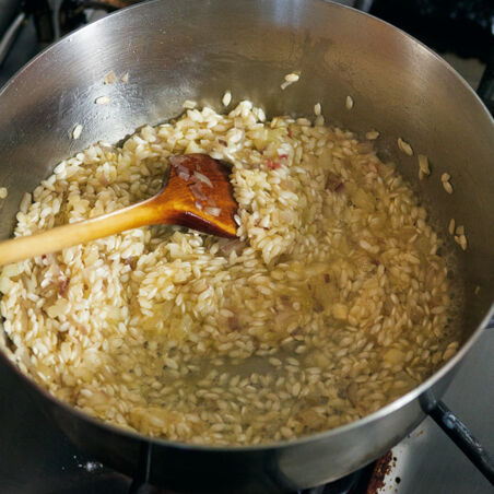 Einen Topf erhitzen, das Öl hineingeben und die Schalotten darin bei mittlerer Hitze 1 Min. unter Rühren anbraten. Den Reis hinzufügen und 1 Min. mitbraten. Mit dem Weißwein ablöschen und diesen vollständig einkochen lassen. Ab jetzt immer, wenn der Reis die Flüssigkeit aufgesogen hat, ca. ein Viertel der Brühe hinzufügen und auch zwischendurch regelmäßig rühren.