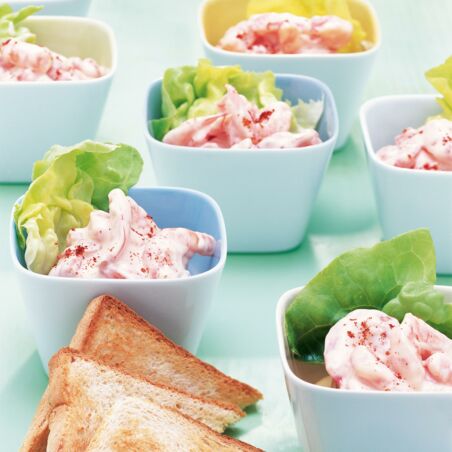 Die Garnelen in die Gläser oder Schälchen füllen. Sauce darüber löffeln, Paprikapulver aufstreuen und aufessen.