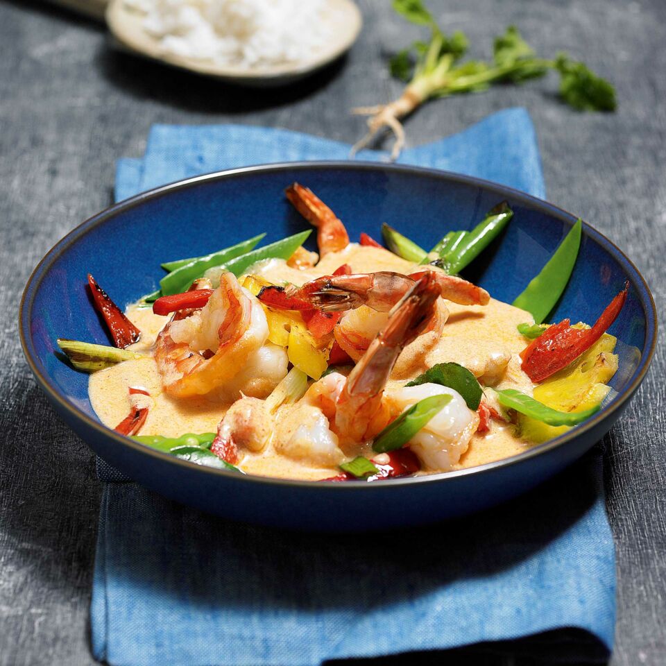 Den Koriander (falls verwendet) waschen und trocken schütteln, die Blätter abzupfen, grob hacken und zusammen mit dem Frühlingszwiebelgrün über das Curry streuen. Die Limettenblätter vor dem Essen entfernen. Als Beilage zum Garnelencurry schmecken Basmatireis oder thailändischer Duftreis.