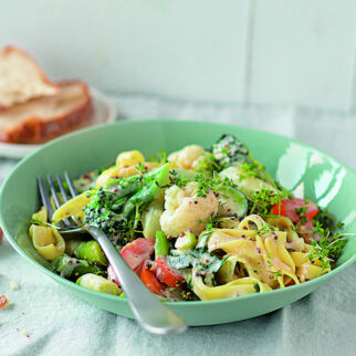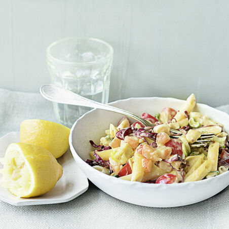 Die Salsa zum Servieren mit Salz und Pfeffer abschmecken und mit frisch gekochter Pasta (z. B. Penne, Farfalle oder Spaghetti) mischen.