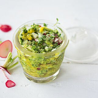 Im Frühling, wenn es endlich wieder frische Kräuter gibt, können Sie auch noch 1 EL gehackte Dillspitzen unter die Salsa rühren.
