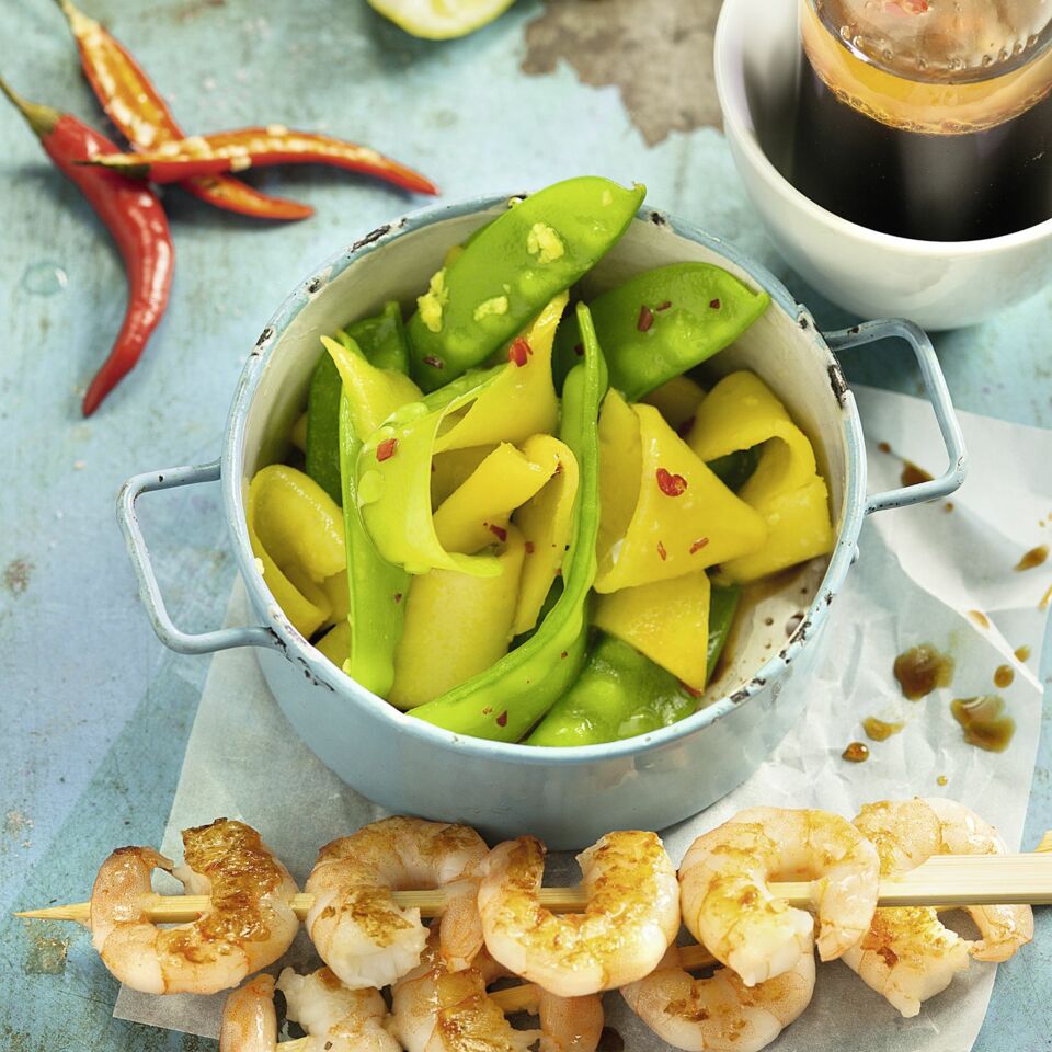 Währenddessen das restliche Rapsöl in einer beschichteten Pfanne bei starker Hitze heiß werden lassen. Die Garnelenspieße darin von jeder Seite ca. 2 Min. anbraten. Wenn die Spieße zu schnell bräunen, die Hitze etwas reduzieren. Den Mangosalat nochmals mit Salz abschmecken, portionsweise anrichten und mit den Garnelenspießen servieren.