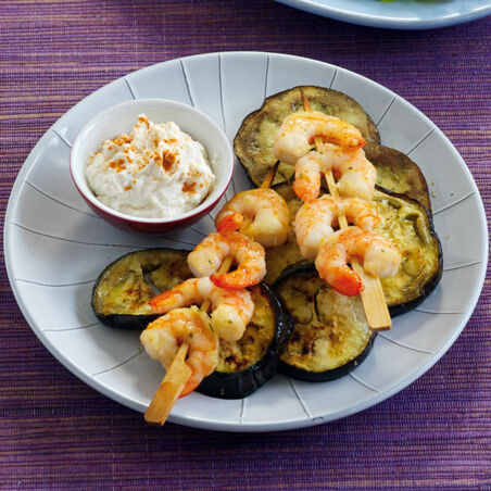 Die Spießchen betten sich auf gebratene Auberginen und werden vor dem Genuss in würzige Parmesan-Frischkäse-Creme getunkt.