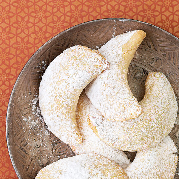 Den Backofen auf 200° (Umluft 180°) vorheizen. Ein Backblech mit Backpapier belegen. Den Teig auf Mehl sehr dünn ausrollen. Kreise von 8 cm Ø ausstechen. Jeweils 1 Marzipanstück auf einen Kreis legen, den Kreis zum Halbmond falten, die Ränder gut andrücken und die Halbmonde zu Hörnchen biegen. Auf das Backblech legen und im Ofen (Mitte) in 15-20 Min. goldbraun backen. Auf ein Kuchengitter setzen und dick mit Puderzucker bestäuben.