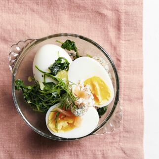 Die Förmchen in eine größere ofenfeste Form stellen. Das kochende Wasser in die große Form gießen, sodass die Förmchen bis zur Hälfte im Wasser stehen. Die Eiermischung im Wasserbad im heißen Ofen (unten) 10-12 Min. garen, bis das Eiweiß gestockt, das Eigelb aber noch flüssig ist. Die gebackenen Eier heiß servieren. Dazu passt frisches oder geröstetes Weißbrot.