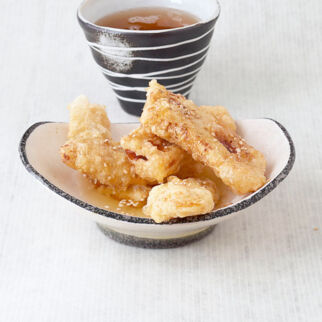 Das Öl zum Ausbacken in einem Wok oder Topf erhitzen. Die Fruchtstücke einzeln in den Teig tauchen, etwas abtropfen lassen und im heißen Fett knusprig ausbacken. Mit dem Schaumlöffel herausheben und auf Küchenpapier entfetten.