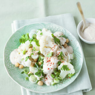 Den Backofen auf 220° vorheizen, ein Backblech mit Backpapier belegen. Den Blumenkohl waschen und in 2 cm große Röschen zerteilen. Die Kichererbsen in ein Sieb abgießen, kalt abspülen und abtropfen lassen.