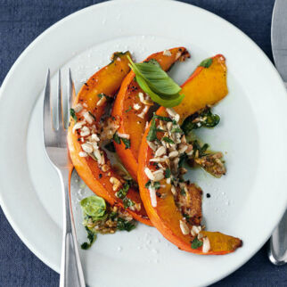 Das Butterschmalz in einer weiten Pfanne erhitzen, die Kürbisspalten portionsweise hineingeben und bei mittlerer Hitze von beiden Seiten jeweils 2-3 Min. braten. Eventuell warm halten, bis alle Spalten gebraten sind.
