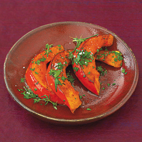 Die Kräuter waschen und trocknen, die Blätter hacken. Die Kürbisspalten mit den Kräutern bestreuen, salzen und pfeffern.