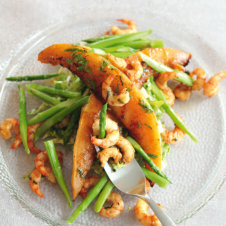 Am besten passt Thai-Spargel in den Salat, da er schnell gar ist. Wer normalen grünen Spargel verwendet: Die Stangen nach dem Schälen schräg in Scheiben schneiden.