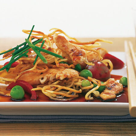 Gebratene Mie-Nudeln mit Huhn und Bambus