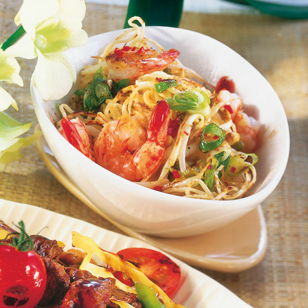 1 weiteren EL Öl im Wok erhitzen, die Chilis darin kurz anbraten. Die Nudeln dazugeben und unter ständigem Rühren ca. 1 Min. braten. Alles zusammenrühren und mit dem Fünf-Gewürz-Pulver, Salz und Pfeffer abschmecken.